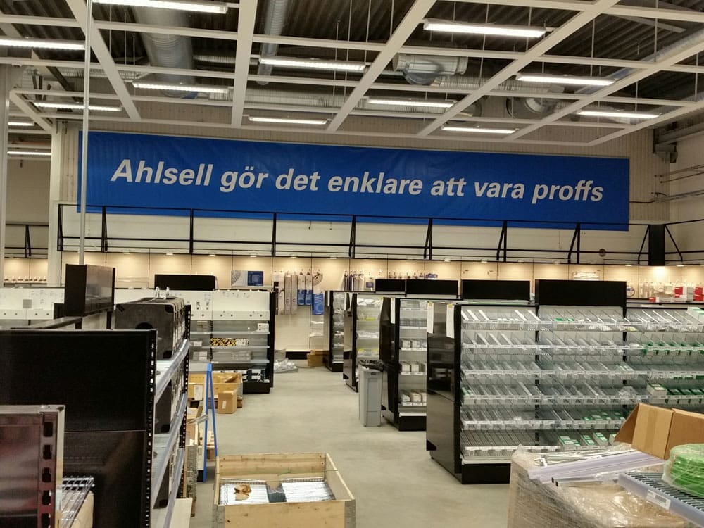 Ahlsell fortsätter sin frammarsch på att både etablera nya men även rusta upp befintliga butiker. Här kommer lite bilder som är tagna mitt under bygget av etableringen i Biskopsgården i februari. Både skyltar och vepor är framtagna och levereade av oss.