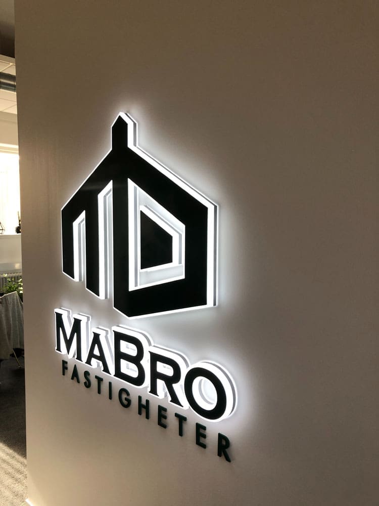 En skylt som genom åren har haft många namn är den vi i de flesta sammanhang nuförtiden kallar för ”full acrylic”. En riktigt slimmad skylttyp helt i akryl för lägen som kräver den där extra känslan av detaljrikedom, kvalitet och en riktigt fin ljusbild. Den blev så populär när den kom att vi glömt prata om den på sista tiden. Bara lugn, vi har den kvar! Här gestaltad i form av Mabros fina logotyp där ljuset faller ut på sidorna och genom outlinen på fronten.