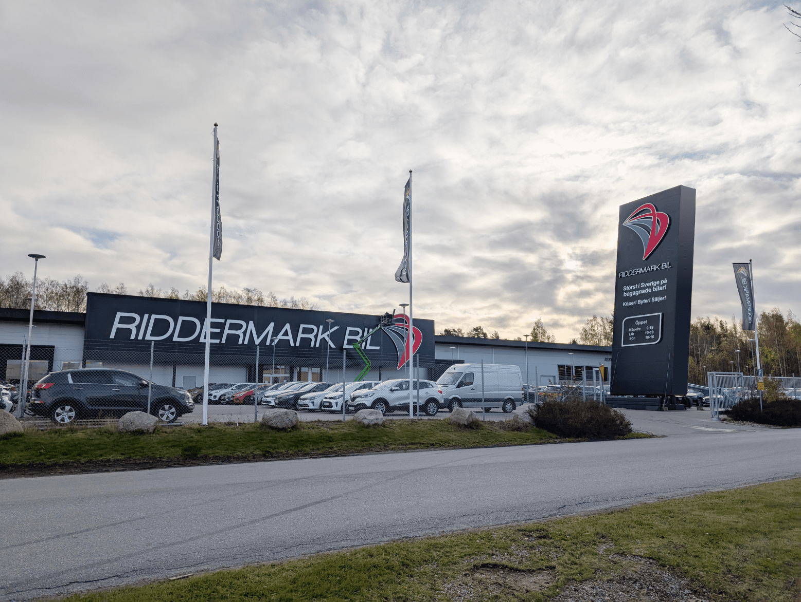 Här kommer ett uppdrag gällande exteriör skyltning som nyligen blev klar till Riddermark Bil i Örebro. Invändigt fick även kunddisken ett litet “smycke” som blev en kul kontrast till den stora fasadskylten. Den lilla skylten är totalt 2m lång och symbolen är 0,37m hög jämfört med den stora som är 34,5m med en symbol på 6,88m!