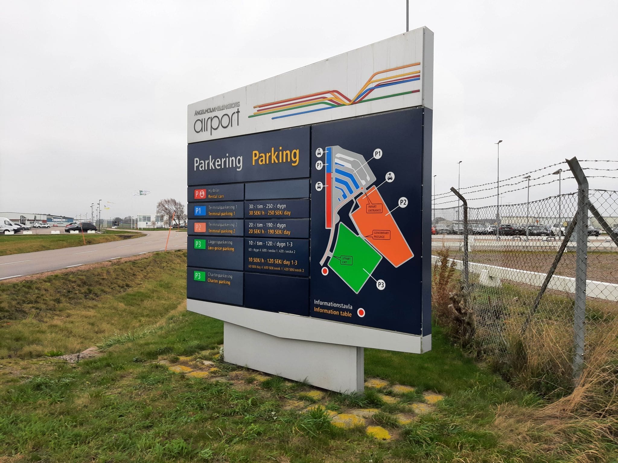 För en tid sedan fick “Världens bästa lilla flygplats” uppdaterad hänvisning på parkeringen som kompletterar de befintliga pylonerna. Även inne i ankomsthallen får man hjälp med att komma ihåg.