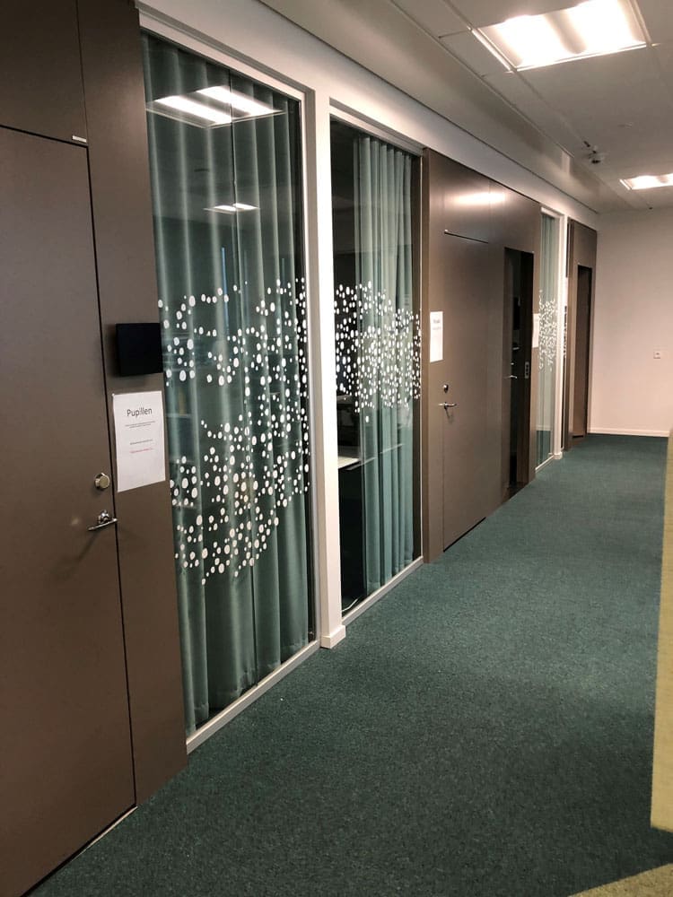 Samtidigt som vi sett till att följa arkitektbyråns inriktning, har vi kunnat ta ut svängarna rejält och jobbat med en rad olika lösningar och materialval, som förstärker helhetsintrycket. Glas, metall, folie och till och med trä har använts i olika skyltar och hänvisningar.
