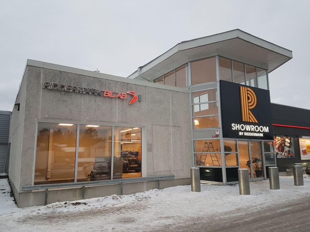 Skyltar till Riddermarks första premiumbutik, Showroom med bilar av den exklusivare sorten.